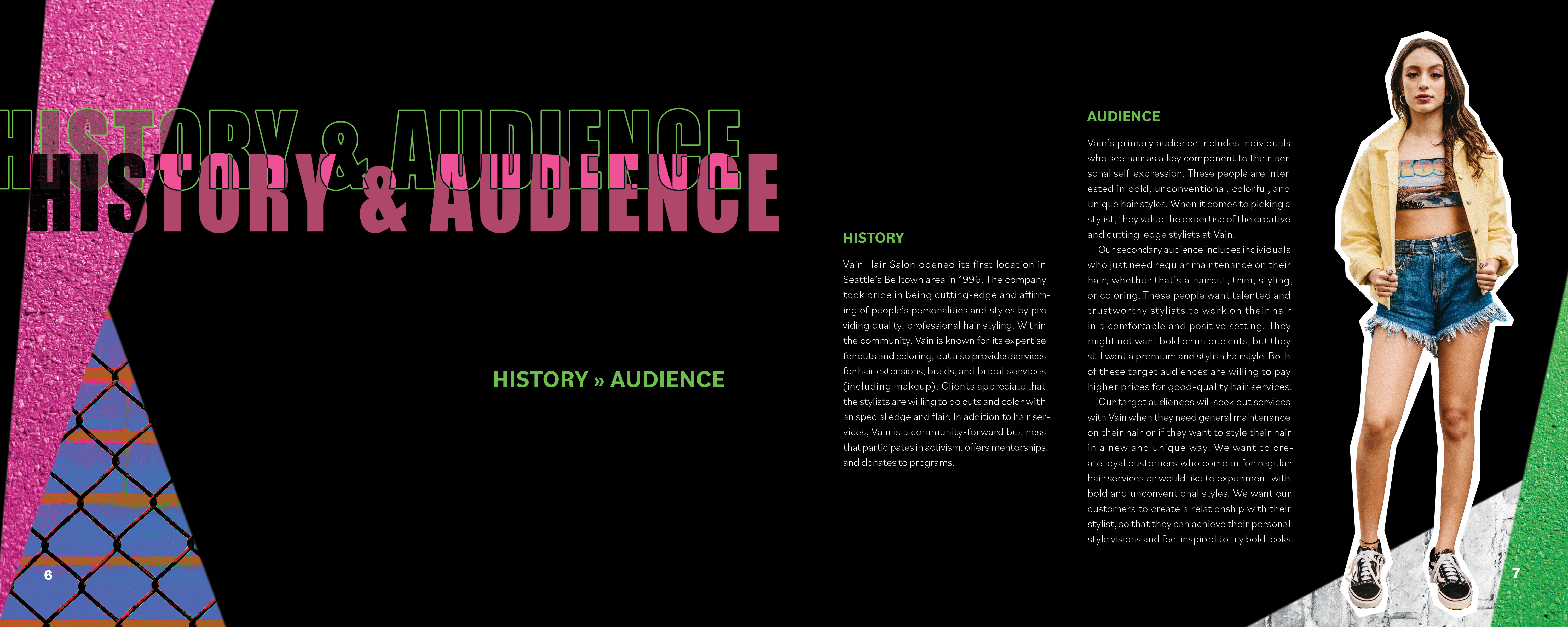 The vibrant colors, urban textures, and authentic images of people work together to reflect the key characteristics and mission statement of Vain Hair Salon. The style is refined, yet edgy which makes it stand out against the crowd and attract Vain’s target audience. The style can be varied but also consistent and cohesive with all the pieces of branding.